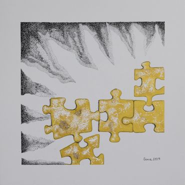 The single character 'Myo' refers to the Myo of Nam Myoho Renge Kyo, the revered chant in Nichiren Buddhism. It has three meanings as depicted in this Triptych. First is to ‘Open’, literally speaking, opening our lives. Second ‘to be fully endowed’, meaning our lives are already endowed with all that we need and the third is to “restore or bring back to life that which is lost”, i.e. it has great restorative power. All these inherently powerful aspects of Myo are depicted metaphorically by the door (to open), the sun (being fully endowed) and the coming together of a jigsaw implying (restoration).